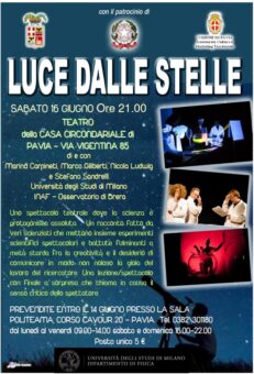 Sabato 16, invece, alle ore 21:00 presso il Teatro della Casa Circondariale di Pavia, andrà in scena lo spettacolo “Luce dalle Stelle” prodotto dall’ Universiità di Milano e dall’Osservatorio Astronomico di Brera dell’INAF. Lo spettacolo ha debuttato al Teatro della Tosse di Genova, nell’ambito del Festival della Scienza 2009 ed è stato in cartellone al Teatro Verga di Milano per le stagioni 2009-2010 e 2010-2011.