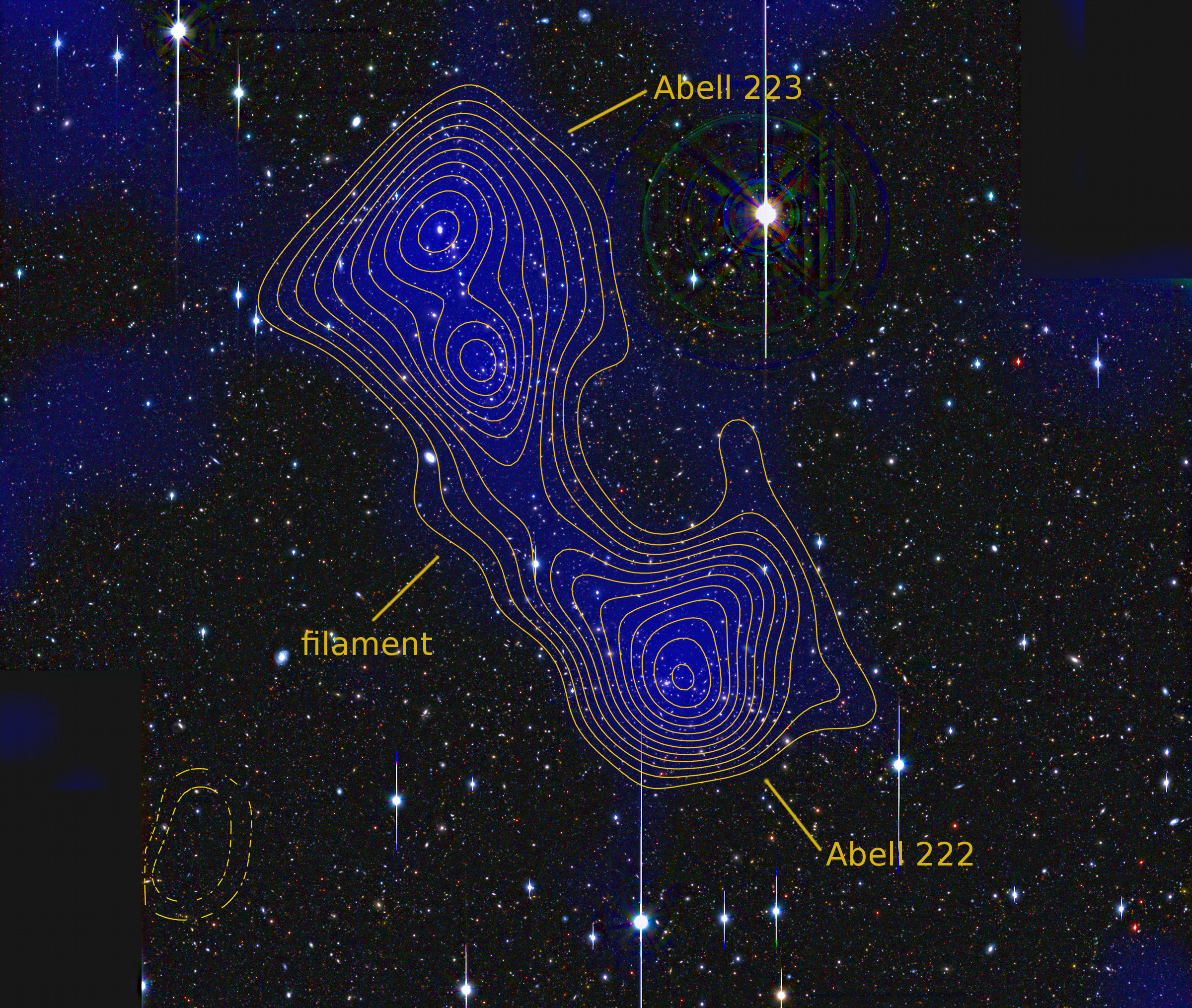 Immagine degli ammassi di galassie denominati Abell 222 e 223, connessi da un filamento di materia oscura. I toni di colore blu e i contorni in giallo indicano la distribuzione e la concentrazione della massa. L'immagine nel cielo copre una superficie che è circa doppia della grandezza apparente della Luna piena. Crediti: Jörg Dietrich, University of Michigan/University Observatory Munich