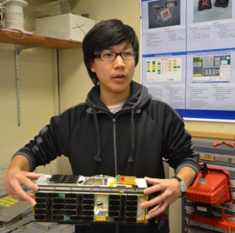 Jerry Kim, uno degli studenti di Berkeley (ora ingegnere), regge il nanosatellite CINEMA, qui fotografato nel gennaio 2012 prima di essere imballato e spedito alla NASA. Crediti: Robert Sanders/UC Berkeley