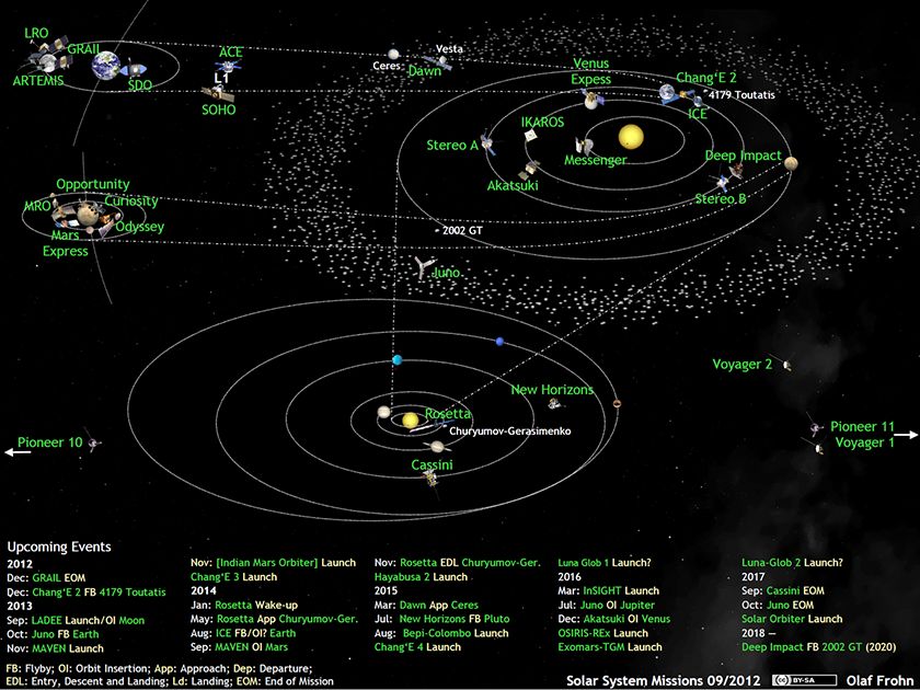 L’immagine che proponiamo questa settimana non è esattamente una Immagine dal Sistema Solare (come abbiamo chiamato la rubrica), ma la rappresentazione grafica del nostro sistema e dei vari oggetti celesti che lo compongono e di tutti i satelliti e sonde che lo esplorano e lo studiano, aggiornata al primo settembre 2012. Una bella immagine che con un semplice colpo d’occhio ci permette di comprendere lo sforzo che l’uomo fa per conoscere non solo il proprio pianeta, ma anche ciò che gli esterno, a partire da ciò che è vicino e raggiungibile o cercando di andare oltre il nostro sistema planetario con sonde come la Voyager 1 che sta entrando in quell’area fortemente turbolenta che sta tra la fine del campo gravitazionale del Sole e l’inizio di quello della stella più prossima, il cosiddetto spazio interstellare. Mancano qui gli occhi che scrutano fuori dal sistema solare, verso altre stelle e altre galassie, occhi sia dallo spazio che da terra. Ma appunto questo è uno sguardo suy ciò che l’uomo fa per studiare il proprio sistema.
