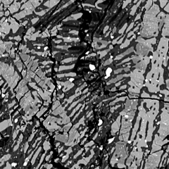 Struttura cristallina della meteorite ALHA81001. L'immagine rappresenta una sezione 0.5x0.35 mm della meteorite vista al microscopio elettronico. Le regioni più scure sono composte da un materiale a grana fine che conserva tracce dei campi magnetici un tempo presenti su Vesta. Crediti: MIT Paleomagnetism Laboratory e MIT Experimental Petrology Laboratory