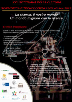 Sempre in Sicilia, ma questa volta a Palermo, l’INAF – Osservatorio Astronomico di Palermo, la Facoltà di Ingegneria, il Dipartimento di Fisica, e il Dipartimento di Biologia Animale dell’Università degli Studi di Palermo, l’Associazione PALERMOSCIENZA, Astrid Associazione Culturale e Coordinamento Palermo Ciclabile – FIAB, hanno ideato per l’occasione una manifestazione congiunta dal titolo: La ricerca: il nostro mondo. Un mondo migliore con la ricerca, nell’ambito delle iniziative per la XXII Settimana della Cultura Scientifica e Tecnologica si svolgerà dal 15 al 21 Ottobre 2012.