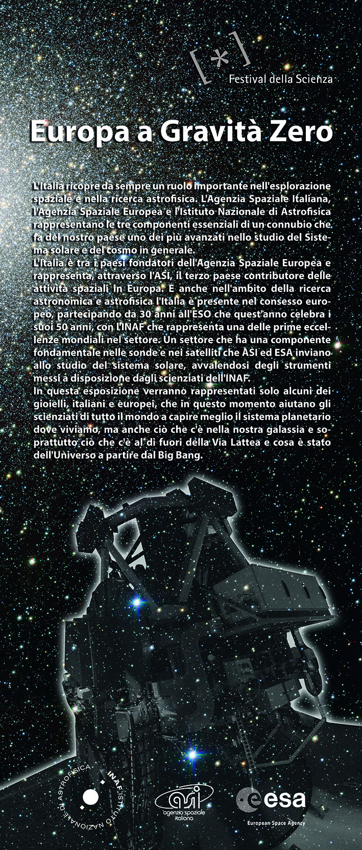 Questo nostro voler essere pervasivi ha spinto gli organizzatori a chiederci di non mancare allo Spazio Europa in realizzazione a Palazzo della Borsa, chiedendoci, cosa che abbiamo fatto con piacere, di coinvolgere con noi ASI e ESA. E così è nato lo spazio Europa a Gravità Zero. I totem descrittivi di questo spazio hanno come immagine di fondo ancora una volta VST.
