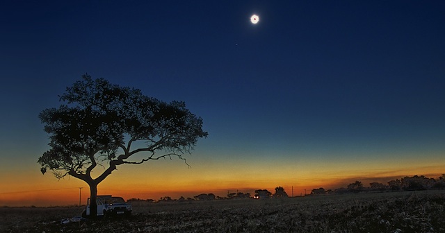 Un’eclissi solare avviene quando la Luna passa tra il Sole e la Terra e copre, parzialmente o completamente, il Sole alla nostra vista. Questo può succedere solo quando c’è Luna Nuova e se il Sole e la Luna visti dalla Terra sono perfettamente allineati. In una eclissi totale, come in questo caso, il disco del Sole è completamente oscurato dalla Luna. Nelle eclissi parziali e anulari solo una parte del Sole è oscurato.