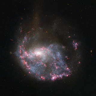 La piccola galassia ha attraversato il centro di NGC 922. Il suo passaggio ha creato delle increspature che hanno sconvolto le nubi di gas, ed ha innescato la formazione di nuove stelle la cui radiazione illumina il gas residuo. Il brillante colore rosa risultanteè un segno caratteristico di questo processo, ed è causato da gas di idrogeno eccitato (l’elemento dominante in nubi di gas interstellare). Questo processo di eccitazione e di emissione di luce dei gas è simile a quella delle insegne al neon.