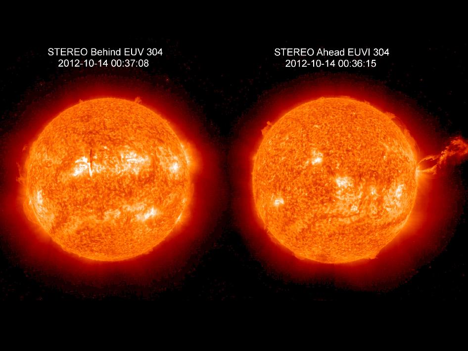 Questo permette di spiegare l’apparente diversità delle due immagini realizzate in contemporanea. A prima vista, la prominenza solare che dirompe dall’atmosfera, visibile nell’immagine a destra realizzata da STEREO-A, sembra del tutto assente dall’immagine a sinistra. In realtà, questo secondo scatto, opera di STEREO-B, è stato realizzato da una posizione “di fronte”. E guardando meglio, è chiaramente identificabile una linea verticale piu scura, appena a sinistra del centro del disco, che corrisponde all’eruzione ripresa dal primo spacecraft.