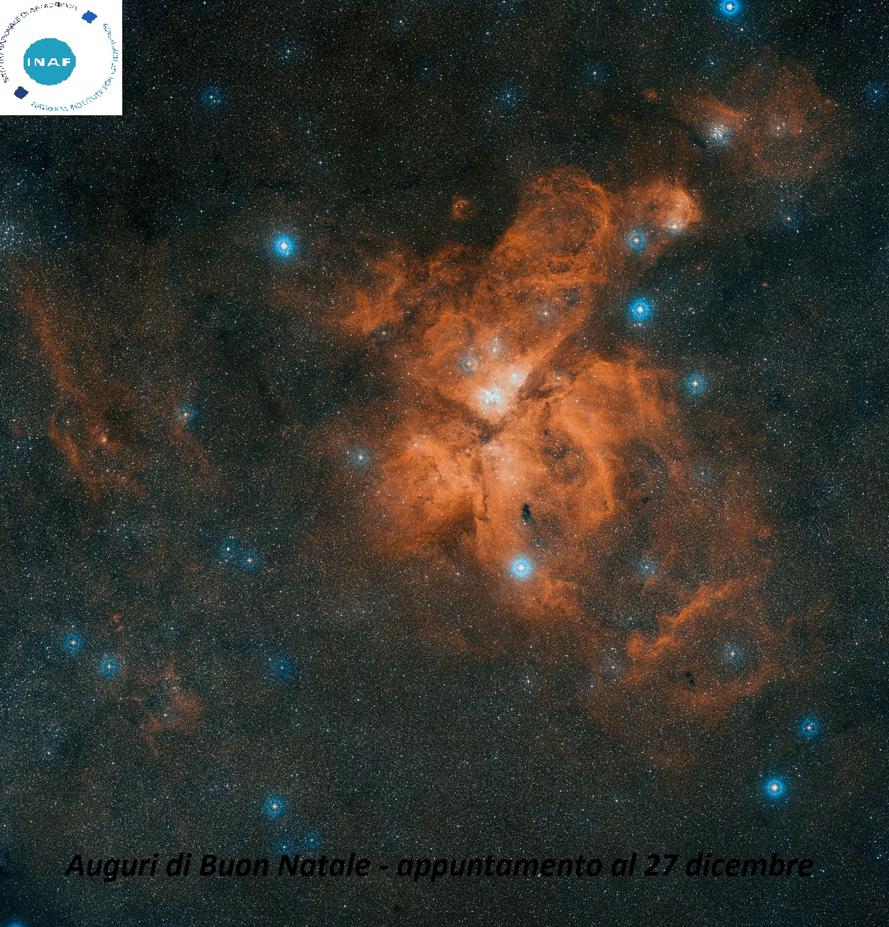 Newsletter anticipata per la vigilia di Natale. Media INAF interrompe per il 25 e il 26 i suoi aggiornamenti quotidiani. Tornerà alla sua regolarità il 27. Per gli auguri un'immagine tutta italiana, quella della Nebulosa Carina ottenuta con il telescopio VST. Buone feste a tutti i nostri lettori.
