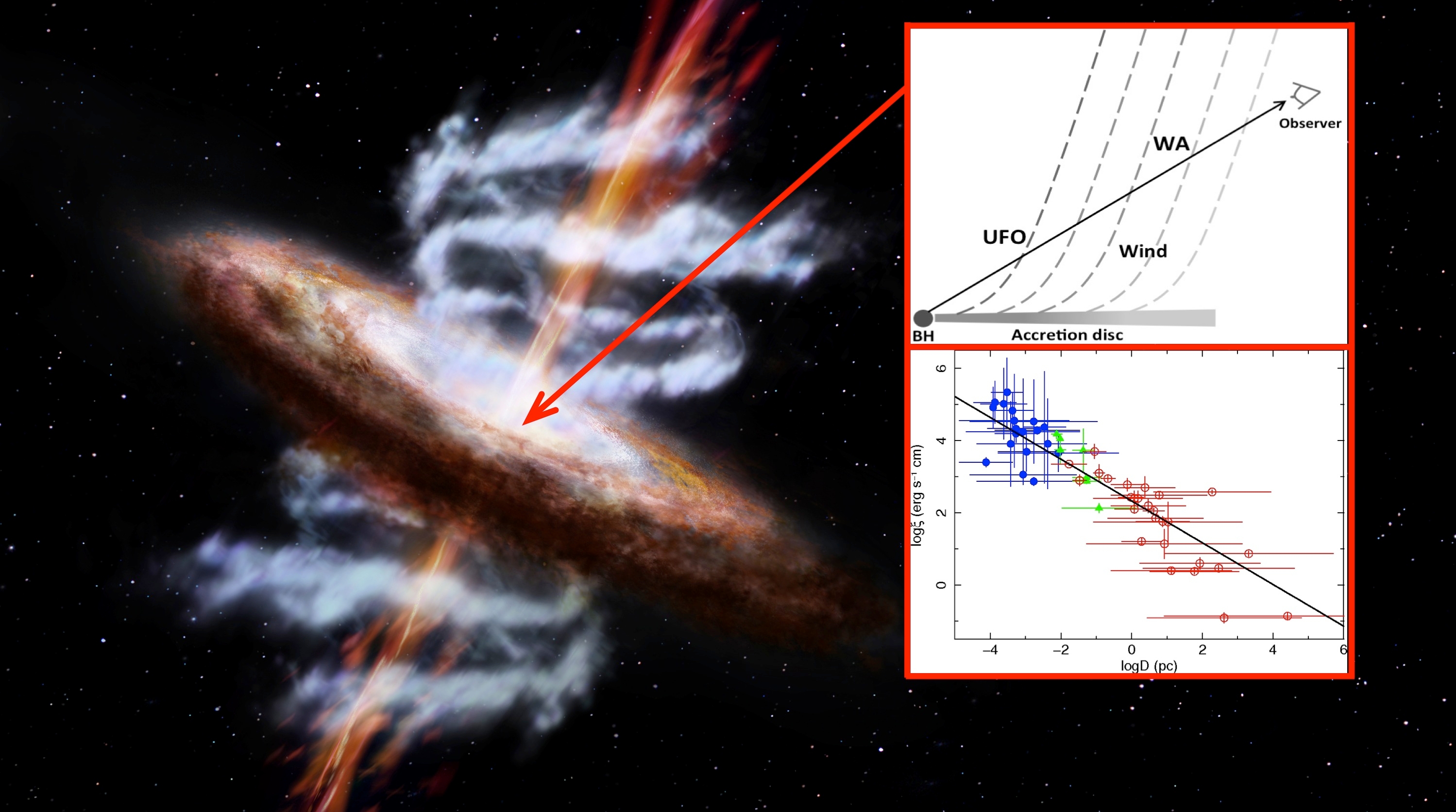 Rappresentazione artistica di un buco nero circondato dal suo disco d’accrescimento e avvolto nei venti di gas ionizzato. Nel riquadro superiore, un’illustrazione schematica della stratificazione del vento emesso dal disco di accrescimento, dagli strati più vicini al buco nero (BH) centrale, gli ultra-fast outflows (UFO), a quelli più lontani, i warm absorbers (WA). Nel riquadro inferiore, i dati raccolti dai telescopi X e utilizzati nello studio: i punti blu in alto a sinistra, ad alta ionizzazione e piccola distanza dal buco nero, corrispondono agli UFO; i punti rossi in basso a destra, a bassa ionizzazione e grande distanza dal buco nero, corrispondono ai WA. In verde gli assorbitori a ionizzazione intermedia.