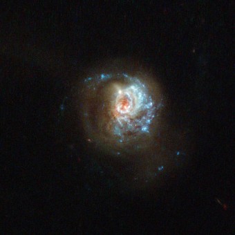 Nell’immagine si può notare un brillante ammasso di materiale che sembra avvolgere la galassia dando vita ad una forma a vortice. Le regioni nelle quali le stelle si stanno formando sono evidenziate da punti azzurri brillanti lungo i bracci galattici.