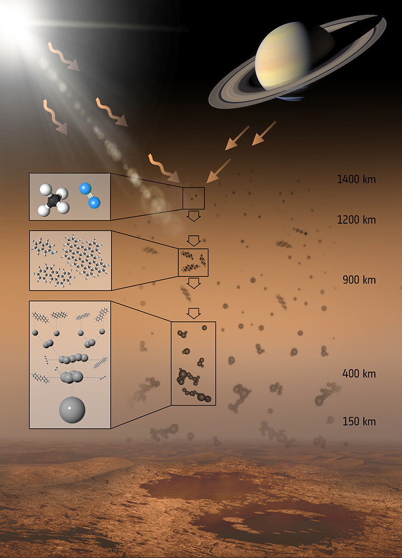 Rappresentazione schematica del processo che partendo dagli idrocarburi PAH porta alla formazione degli aerosol di Titano. (ESA / ATG medialab)