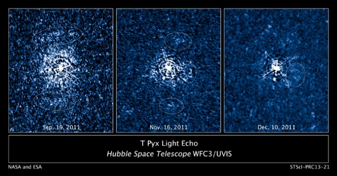 E’ un po’ come il gran finale in uno spettacolo di fuochi d’artificio, quando gli ultimi “botti” illuminano la polvere e il fumo rimasto dalle esplosioni precedenti. Allo stesso modo, usando il telescopio spaziale Hubble della NASA per osservare la luce emessa dal vicino sistema doppio T Pyxidis, una nova ricorrente, nell’aprile 2011, un gruppo di ricercatori è riuscito a sfruttare un lampo di luce proveniente dall’ultima esplosione stellare per osservare il materiale eruttato in precedenza dalla stella. Il tutto in 3D.