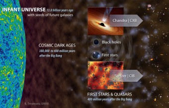La scoperta è avvenuta confrontando le mappe del bagliore residuo (la luce che rimane dopo aver sottratto l’emissione di tutte le sorgenti note) in banda infrarossa e in banda X, ottenute rispettivamente con i telescopi spaziali della NASA Spitzer e Chandra. Già i dati sul bagliore residuo osservato, sin dal 2005, dal satellite Spitzer avevano portato gli scienziati a concludere che potesse trattarsi del fondo cosmico a raggi infrarossi (CIB), una luce risalente all’epoca in cui prendevano forma le prime strutture dell’universo, fra le quali stelle e buchi neri primordiali. Elaborando i dati multibanda raccolti, nel 2007, nella stessa regione di cielo ma con un telescopio sensibile ai raggi X, Chandra (sempre della NASA), Cappelluti ha prodotto a sua volta mappe della radiazione residua. E di nuovo, proprio come con Spitzer, è rimasto un bagliore di fondo, questa volta però in banda X: il CXB, dunque, o fondo cosmico a raggi X.