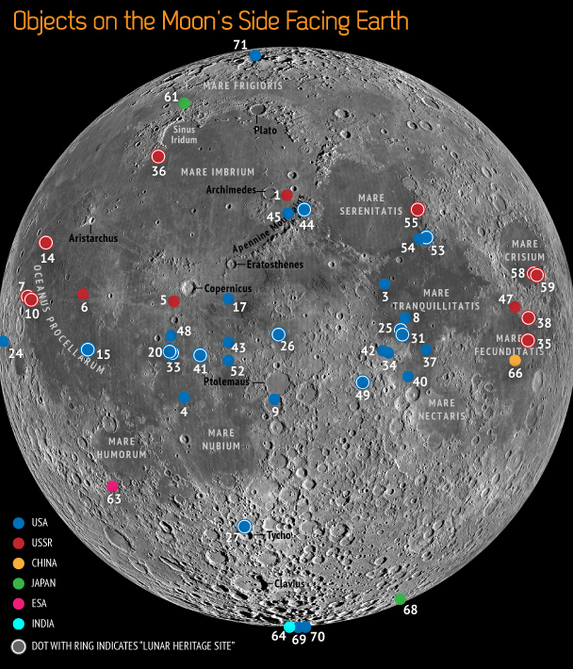 Il punto di partenza per la ricerca sarà la mappa dei punti di allunaggio dei ben 71 oggetti (in alcuni casi, parti diverse della stessa missione) che dal 1959 abbiamo mandato sulla Luna. Senza risparmiare nemmeno la faccia nascosta, dove se ne trovano quattro.