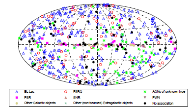 Il catalogo mostra che di quelle 514 sorgenti, 449 possono essere associate a sorgenti conosciute, 393 delle quali sono nuclei galattici attivi o blazar: questi ultimi oggetti dominano quindi il cielo in queste lunghezze d’onda. Le pulsar nel catalogo sono invece 27. Quanto alle sorgenti non ancora identificate, sono distribuite in modo uniforme lungo il piano galattico e i ricercatori ritengono che per la maggior parte si tratti di blazar.