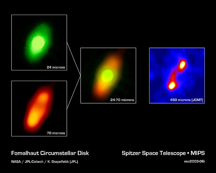 Il disco attorno a Fomalhuat osservato in diverse lunghezze d’onda dal telescopio Spitzer. Sono evidenti le asimmetrie nella concentrazione di polveri, che si potrebbero spiegare con la presenza di due pianeti.