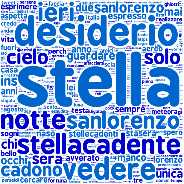 «Tanto è sempre lo stesso, ogni anno: il Napoli che vince lo scudetto!», twitta l’utente PaoloPiccirillo. E a fargli compagnia, esprimendo desideri e pensieri con l’hashtag #stellacadente (o #stellecadenti, al plurale), siete stati in tanti: fra tweet e retweet, 3667 in pochi giorni, quasi tutti concentrati nella notte di San Lorenzo. Quanto abbia contribuito l’invito di Media INAF è difficile dirlo. Però è possibile tentare qualche statistica. Per l’intera durata dell’iniziativa, dal 9 al 15 agosto, abbiamo infatti collezionato tutti i tweet che parlavano di stelle cadenti, registrando l’ora d’invio e – per i 134 che le indicavano – le coordinate geografiche del luogo dal quale provenivano.