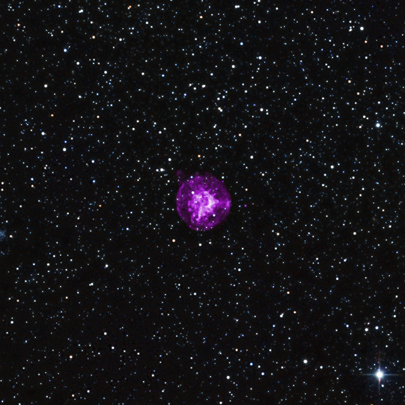 SNR B0049-73.6 è una supernova localizzata nella Piccola Nube di Magellano che ha fornito agli astronomi gli elementi necessari per studiare le esplosioni delle stelle massicce. Chandra ha osservato proprio i resti di questa esplosione, causata dal collasso del nucleo di una stella. I dati provenienti dal telescopio della NASA (in viola) sono stati abbinati a quelli all’infrarosso di 2MASS survey.