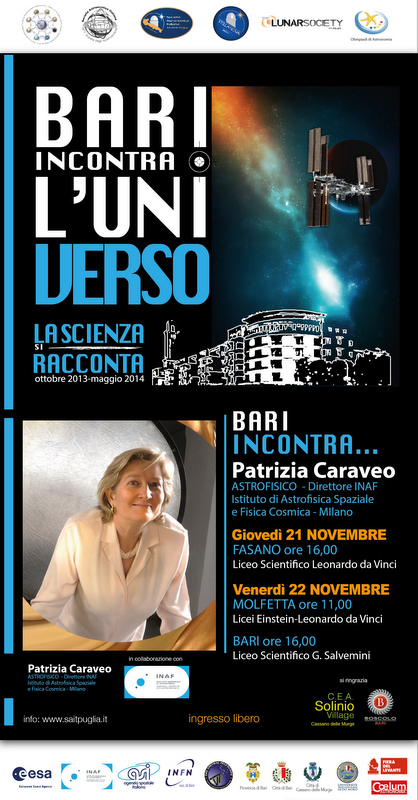 Patrizia Caraveo, direttore dell’INAF – Istituto di Astrofisica Spaziale e Fisica Cosmica di Milano incontra il pubblico e gli studenti di Fasano, Molfetta e Bari nell’ambito della rassegna Bari incontra l’Universo, promossa dalla Società Astronomica Italiana sezione Puglia in collaborazione con INAF, ESA, ASI, INFN, Virtual Telescope Project e Coelum Astronomia.