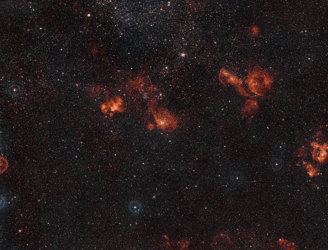 Guardando questa immagine può essere difficile cogliere la vastità di queste nubi – diverse centinaia di anni luce. E non si trovano neppure nella nostra galassia, ma molto oltre. La Grande Nube di Magellano è enorme, ma se confrontata con la nostra galassia è modesta, raggiunge appena i 14 000 anni luce, circa 10 volte meno della Via Lattea.