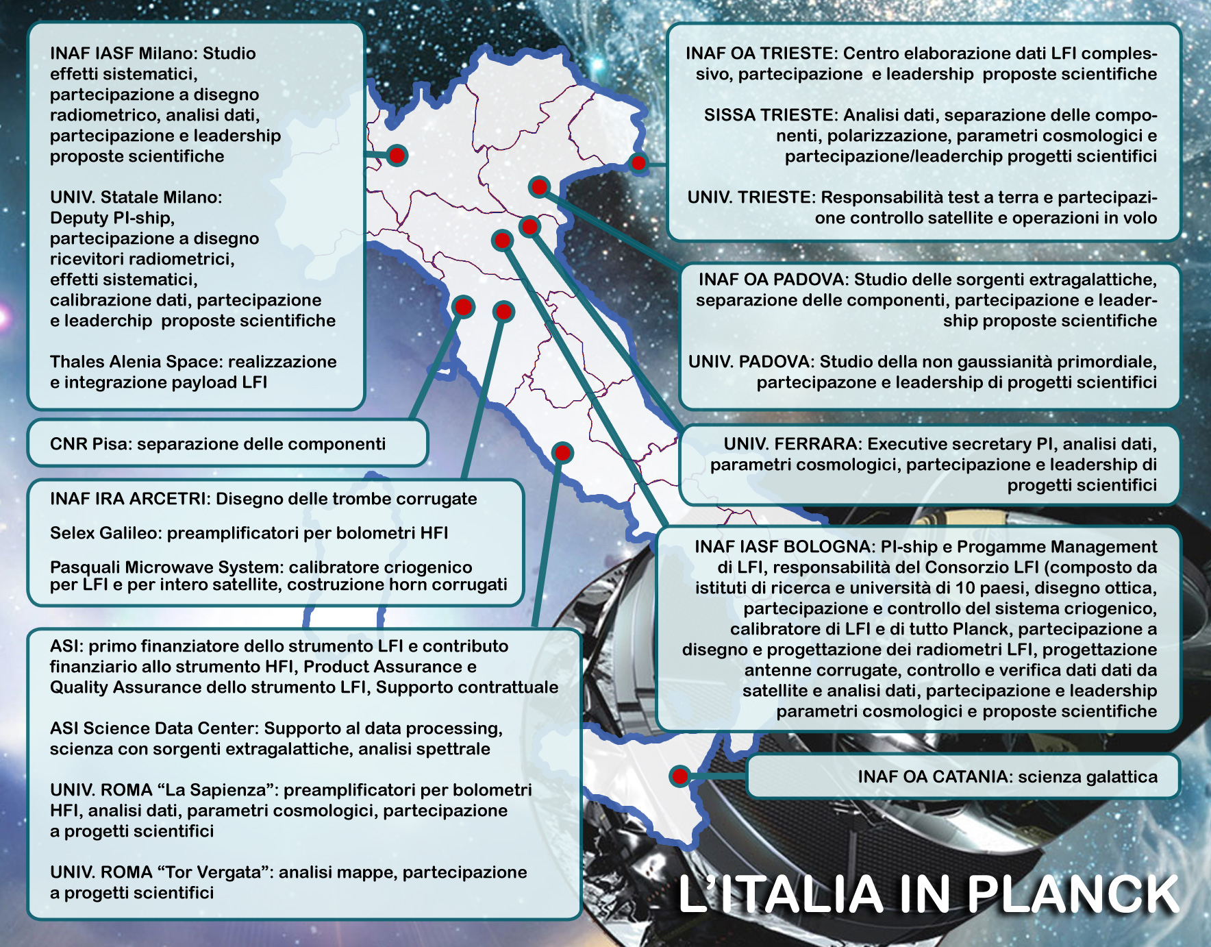 Al quarto posto, secondo argomento astrofisico della classifica, “l’universo quasi perfetto” di Planck, presentato al mondo nel marzo scorso. Il riconoscimento va, per l’esattezza, “agli scienziati del telescopio spaziale Planck dell’ESA per la misurazione più precisa che mai sia stata realizzata del fondo cosmico a microonde”, come recita la motivazione sul certificato inviato a tutti i membri della collaborazione. Un risultato, questo, in gran parte italiano, visto che moltissimi fra gli scienziati di Planck – a partire dal responsabile di uno dei due strumenti a bordo del telescopio, Reno Mandolesi – lavorano presso istituti e università del nostro paese (qui la mappa del contributo italiano all’esperimento).