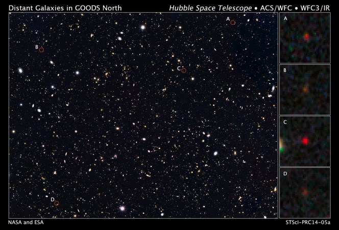 Le quattro galassie (in rosso) ottenute da Hubble come dovevano apparire 500 milioni di anni dopo il big bang.