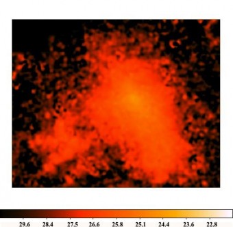 Luce diffusa dell’ammasso dopo aver sottratto il contributo delle galassie. La scala è in magnitudini per arcosecondo al quadrato.