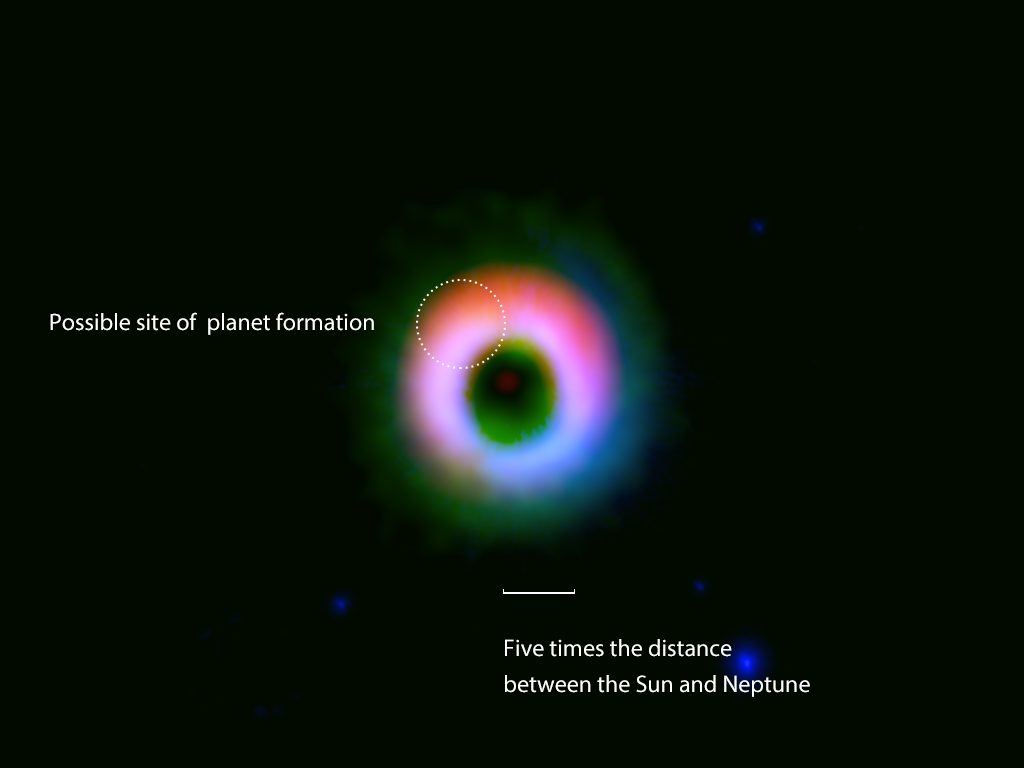 Le immagini ottenute da ALMA mostrano la polvere cosmica, da cui nascono i pianeti, che circonda la giovane stella formando un anello asimmetrico (come si vede nell’immagine). Misurando la densità della polvere nella parte più densa dell’anello, gli astronomi hanno trovato che è altamente possibile che i pianeti si stiano formando in quella regione, che è molto lontana dal centro della stella (circa 5 volte la distanza tra il Sole e Nettuno). È proprio questa grande distanza che ha interessato i ricercatori, perché è la prima volta che viene scoperto un sito di formazione stellare così lontano dalla stella madre nel disco protoplanetario.
