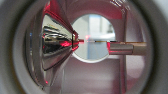Un particolare dell’elettrospray (a destra) e dello spettrometro di massa (a sinistra) usati nell’esperimento. Crediti: Michael Callahan