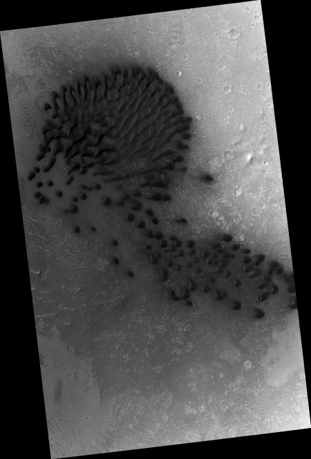 Le dune nella regione Cerberus. Immagine non colorata e modificata. Credit: NASA/JPL/University of Arizona