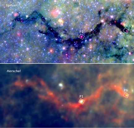 Il team ha studiato due punti specifici all’interno della nebulosa, etichettati nella foto sopra con le sigle P1 e P6. A una prima occhiata sia P1 che P6 sembrano due semplici ammassi nebulosi dalla forma sferica. Ma il dettaglio delle osservazioni ottenute con SMA ha permesso di osservare nei particolari le strutture dei due punti analizzati e di contare così al loro interno untotale di 23 semi cosmici più piccoli, ovvero quelle zone leggermente incandescenti che porteranno alla fine alla nascita di una o più stelle. Le immagini ad alta risoluzione SMA hanno inoltre permesso di differenziare per età ogni seme.
