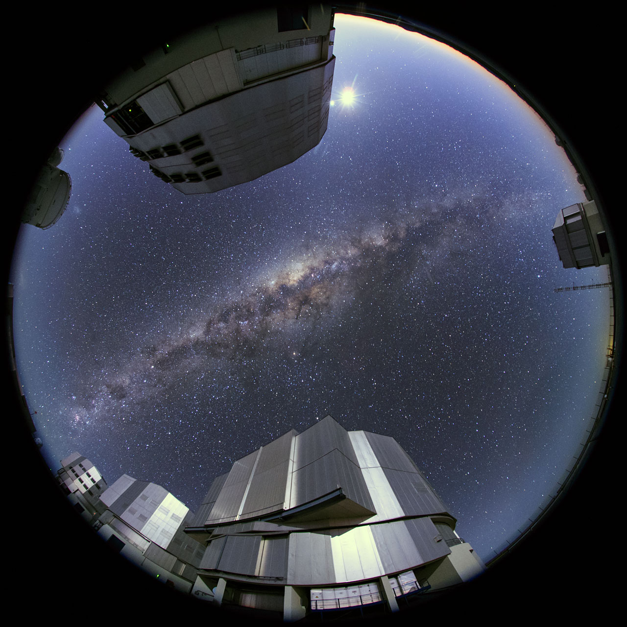 Il luogo dello scatto è Cerro Paranal, 2635 metri sopra il livello del mare, in pieno deserto di Atacama: uno dei posti più aridi e meno piovosi del mondo, e di conseguenza uno dei posti migliori dove osservare le stelle. Non solo a livello professionale, come fanno all’ESO, ma anche a livello più amatoriale: solo in questa foto per esempio si distinguono chiaramente la Luna e Venere, Saturno, qualche stella notevole come Antares, Vega e Altair, e due galassie nane irregolari, satelliti della nostra: le Nubi di Magellano, piccola e grande. (Qui la versione della foto che indica dove cercare cosa in questo cielo stellato). Se vi sembra impressionante già così, sperate di avere la fortuna di poter prima o poi vedere il filmato fulldome che il team ha girato quella stessa notte, e che sarà distribuito gratuitamente tra qualche anno per l’utilizzo nei planetari.