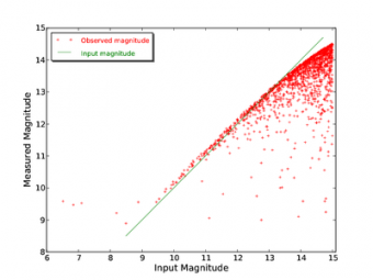 Una simulazione effettuata da PLATO Simulator, che mostra una misura della luminosità delle stelle. Crediti: KU Leuven