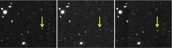 Le frecce indicano il movimento nel cielo di 2012 VP113 in una di sequenza di immagini prese dalla Dark Energy Camera al telescopio Blanco in Cile. Crediti: Scott Sheppard / Carnegie Institution for Science