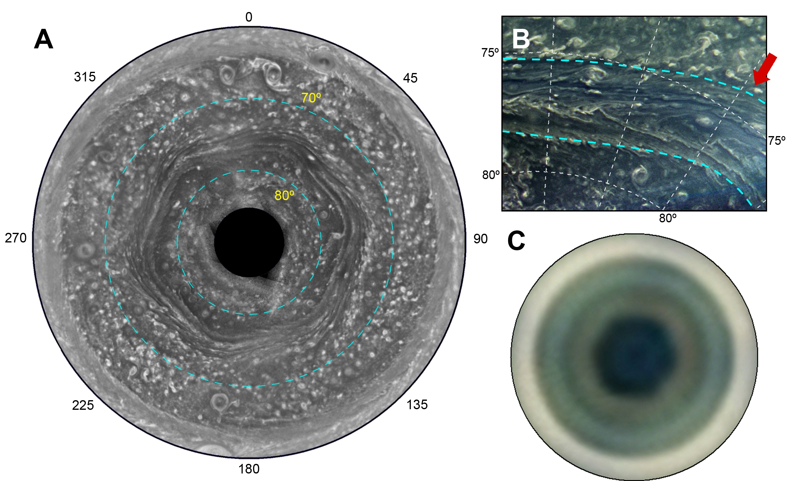 Mappa del polo Nord di Saturno che mostra la struttura esagonale: (A) Cassini ISS (2009); (B) Dettaglio delle nuvole all’interno dell’Esagono, Cassini ISS (2008); (C) Telescopio da 2,2 metri di Calar Alto con AstraLux (2013). Crediti: Planetary Sciences Group UPV/EHU-Cassini NASA/ESA.