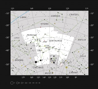 Questa area del cielo australe, nella costellazione del Centauro, ospita molte nebulose brillanti, ciascuna associata a stelle neonate molto calde che si sono formate a partire dalle nubi di idrogeno gassoso. La radiazione intensa prodotta dalle nuove stelle eccita il resto dell’idrogeno circostante, facendo risplendere il gas nelle tinte di rosso caratteristiche delle zone di formazione stellare. Un altro esempio famoso di questo fenomeno è la Nebulosa Laguna un’ampia nube che risplende di simili tinte scarlatte.