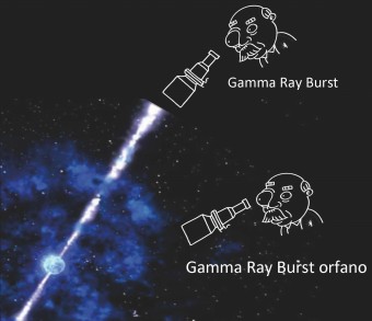 Per ogni lampo di raggi gamma che punta verso la Terra, e che è quindi potenzialmente individuabile dai satelliti in orbita dedicati al loro studio, come Swift e Fermi, ce ne sono almeno 700 che emettono la loro radiazione di alta energia in un’altra direzione e per questo motivo non vengono scoperti. Questi eventi vengono chiamati dagli astronomi GRB orfani: orfani cioè della loro emissione di raggi gamma. La loro differenza con i GRB ‘classici’ è solo una questione di punti di vista: quelli che i satelliti come Fermi e Swift rivelano in media un paio di volte alla settimana sono quella piccola frazione che hanno un getto che punta proprio in direzione della Terra, mentre la maggior parte dei getti puntano in altre direzioni e dovrebbero essere rivelati come GRB orfani.
