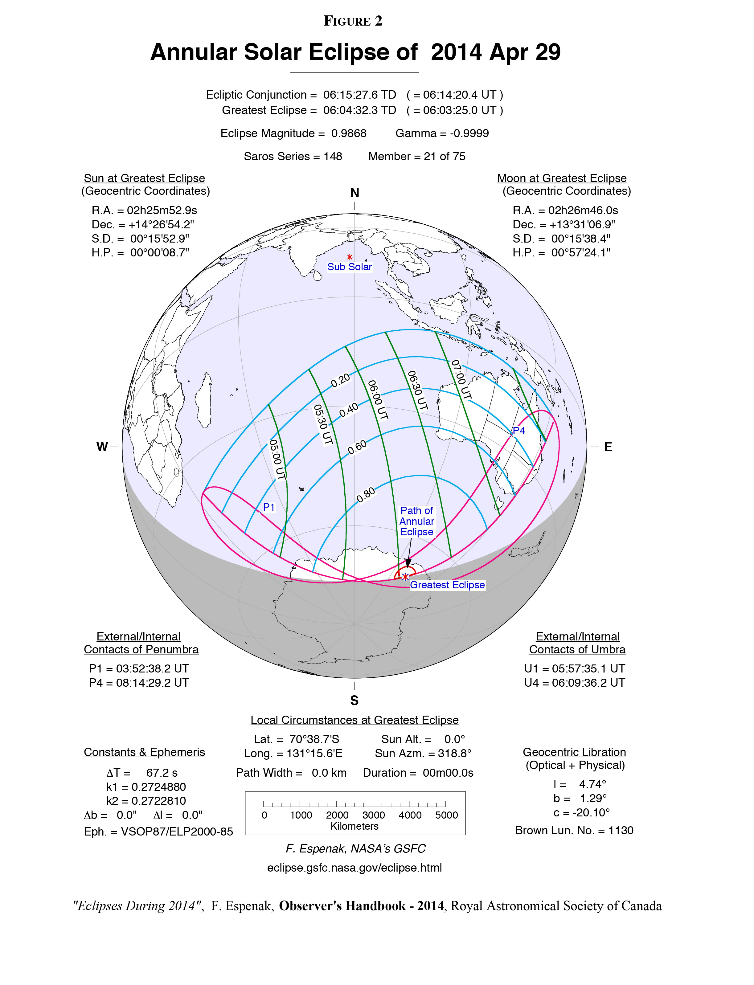 Questa del 29 aprile è anche la prima eclissi solare del 2014. Eclissi insolita perché l’asse centrale del cono d’ombra proiettato dalla Luna sulla Terra sfiora il nostro pianeta in quello che gli astronomi definiscono un caso di eclissi anulare non centrale. Per avere un’idea più precisa della particolarità del sole nero d’Antartide, basti dire che delle 3956 eclissi anulari che si sono verificate nel corso di 5.000 anni di storia (partendo dal 2.000 a.C. e con un occhio al futuro fino all’anno 3000), solo 68 possono venire chiamate non centrali. Per una percentuale dell’1,7 %.