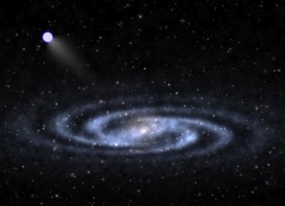 Rappresentazione artistica di una stella che si allontana a ipervelocità dalla parte visibile di una galassia simile alla Via Lattea, addentrandosi nell’alone di materia oscura. Crediti: Ben Bromley, University of Utah