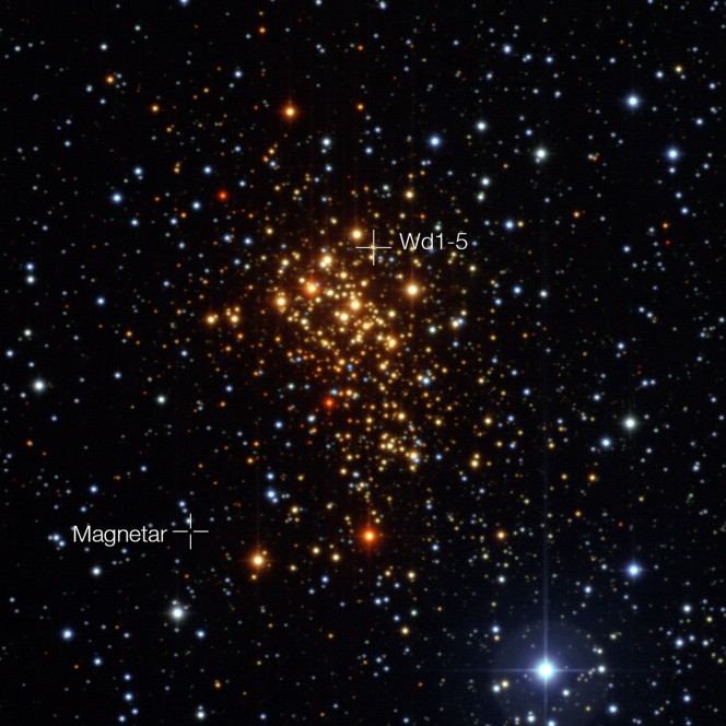 L’ammasso stellare Westerlund 1, a circa 16 000 anni luce dalla Terra nella costellazione australe dell’Ara, contiene una delle circa venti magnetar note nella Via Lattea. Si chiama CXOU J164710.2-455216 ed è stata di grande sconcerto per gli astronomi. Questa scoperta aiuta a capire come si formino le magnetar – un rompicapo che dura da 35 anni – e perché questa particolare stella non sia collassata in un buco nero come gli astronomi si aspettavano.