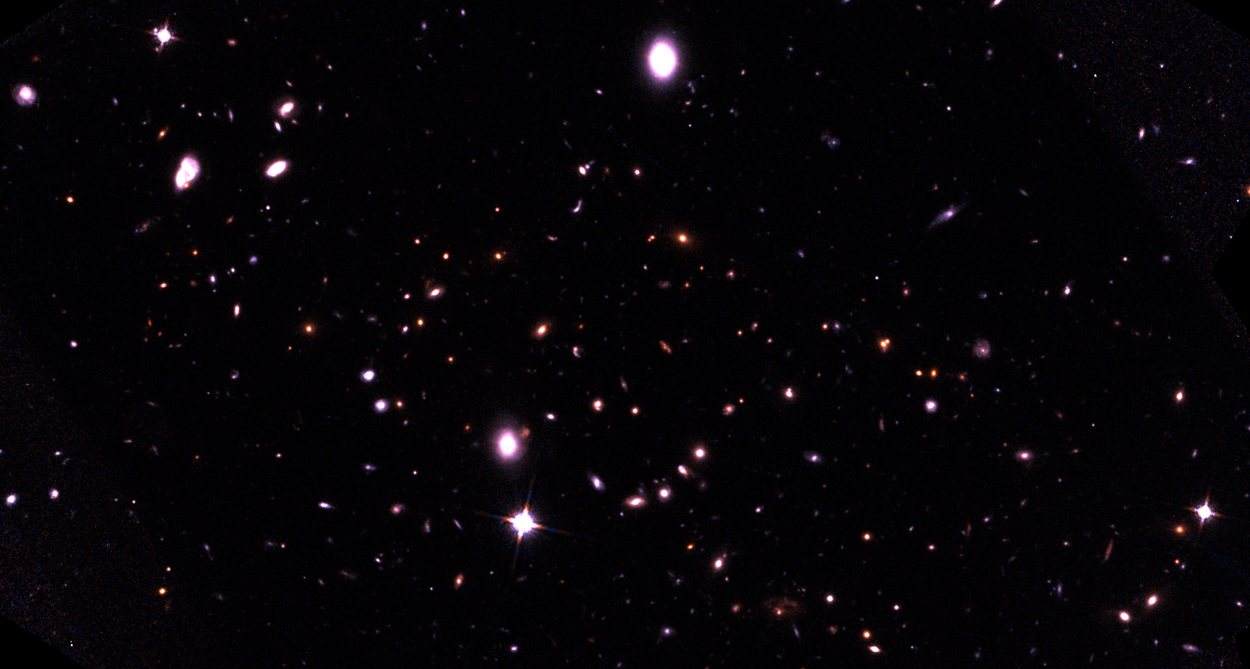 L’ammasso di galassie JKCS 041 visto nell’infrarosso dal telescopio spaziale Hubble. L’immagine in tricomia è di 2.5×1.5 arcmin. Crediti: Stefano Andreon