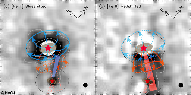 Per studiare la distribuzione dei flussi di gas emananti dalle stelle, i ricercatori si sono avvalsi dello strumento NIFS (Near-Infrared Integral Field Spectrometer) del telescopio Gemini Nord, utilizzando come marcatore il gas di ferro ionizzato ([Fe II]). Nell’analisi spettroscopica, si sono potuti distinguere i getti in avvicinamento rispetto al nostro punto di vista (spettro blueshifted, spostato verso il blu) da quelli in allontanamento (redshifted, spostato verso la parte rossa dello spettro elettromagnetico). Grazie al potere risolutivo raggiunto con le ottiche adattive del telescopio, i ricercatori sono quindi riusciti a determinare l’origine dei flussi di gas, la cui alta velocità (attorno ai 100 km/s) suggeriva che fossero emanati dalle stelle piuttosto che dal disco circumbinario.