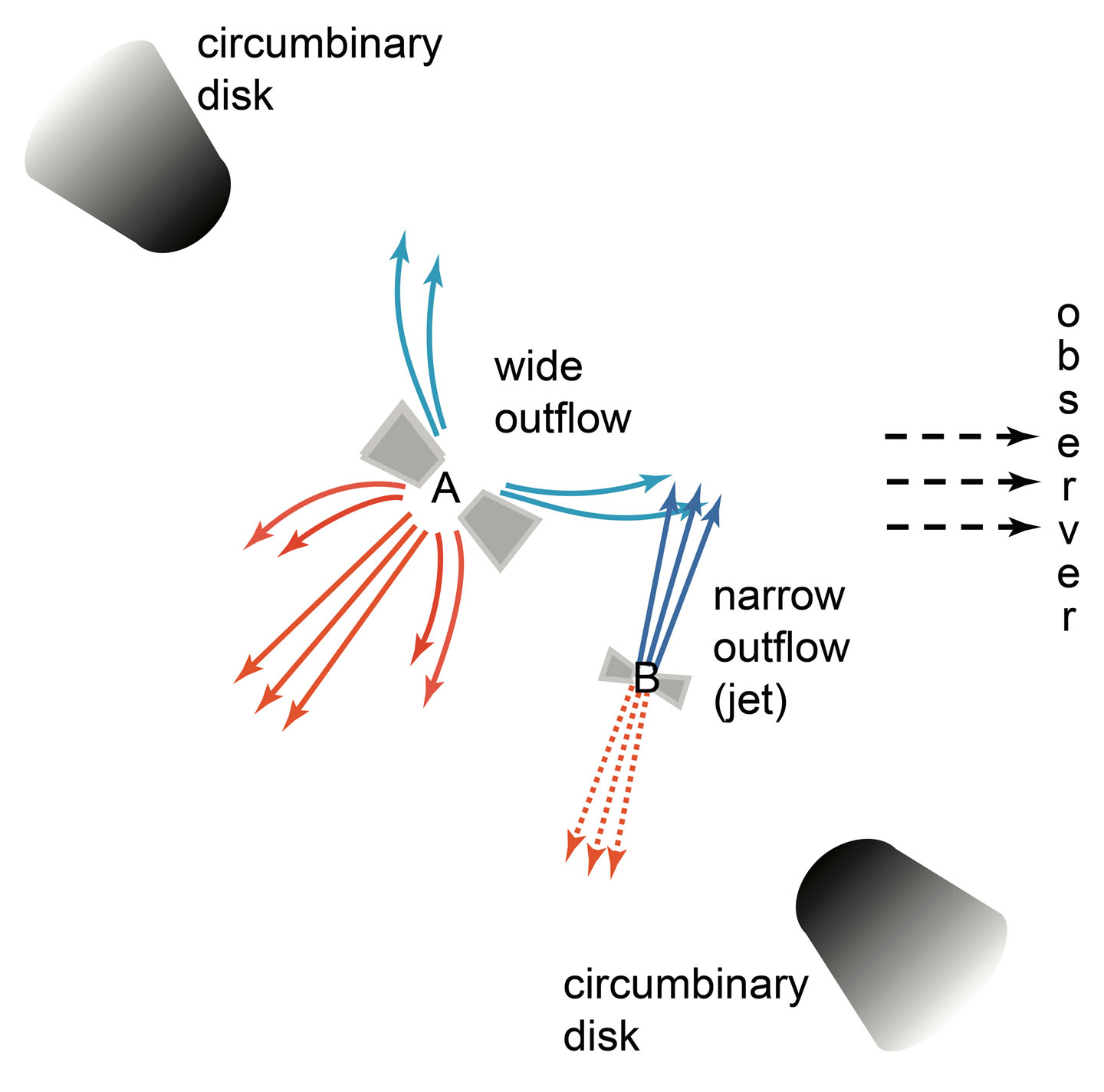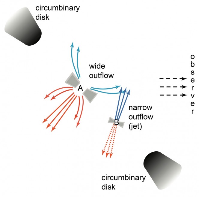 Le giovani stelle per crescere hanno ancora bisogno di risucchiare materia dal nutriente disco di accrescimento da cui sono circondate. E’ un pasto vorticoso, che nella maggior parte dei casi origina dei venti stellari molecolari, dei flussi di gas in uscita da entrambi i poli dell’astro. Mentre sono stati osservati in abbondanza flussi bipolari in uscita da singole giovani stelle, sia sotto forma di getti più collimati (jet) che di flussi più diffusi (outflow), solo poche osservazioni si sono finora spinte a spiare quel che succede all’interno delle coppie di stelle.