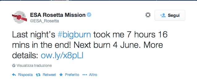 Con un “cinguettìo” su Twitter, il team dell’ESA che manovra la sonda ha annunciato che la fase del “burning” (in gergo tecnico “thruster burn”) è stata portata a termine con successo, fornendo la prima delle tre grandi spinte orbitali che porteranno il veicolo spaziale sulla scia della cometa il prossimo 6 agosto. In questa lunga e delicata fase di commissioning, che segue il risveglio della sonda europea, uno per uno, tutti gli strumenti hanno ripreso vita dopo oltre due anni di ibernazione.
