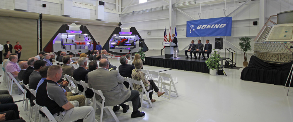 Lo scorso 9 giugno presso gli hangar del Kennedy Space Center, in Florida, Boeing ha presentato un modello in scala 1:1 dell’astro-taxi CST-100. Il veicolo privato potrebbe evitare agli astronauti USA un lancio fuori sede e sganciare la NASA da una Soyuz dipendenza. Crediti: Ken Kremer.