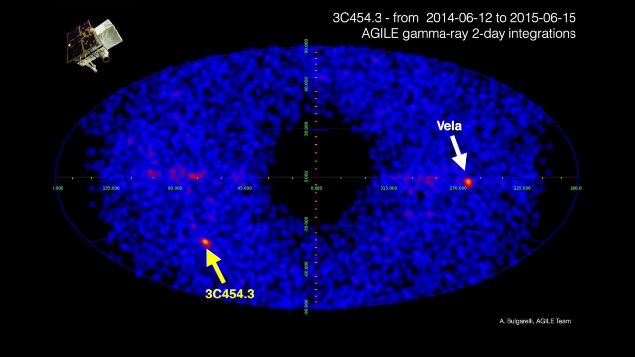 “Un po’ tutto il mondo lo sta guardando e ovviamente anche il satellite AGILE, ora pienamente operativo nella sua modalità spinning, che copre nel suo monitoraggio circa l’80% del cielo ogni giorno” dice Marco Tavani, dell’INAF-IAPS di Roma, responsabile scientifico di AGILE. “Sicuramente ci saranno delle sorprese. L’interpretazione teorica dell’attività registrata nel 2010 si sta rivelando estremamente interessante, dimostrando che la materia espulsa dal buco nero sotto forma di ‘grumi’ o ‘plasmoidi’ sia molto più longeva ed energetica di quanto supposto in precedenza nel suo viaggio lungo il getto. C’è ora molta attesa per quest’ultimo episodio: ricalcherà i livelli massimi raggiunti nel 2010 oppure si attesterà a valori inferiori? L’emissione sarà simile a quella considerata dai modelli teorici oppure sarà diversa ?”