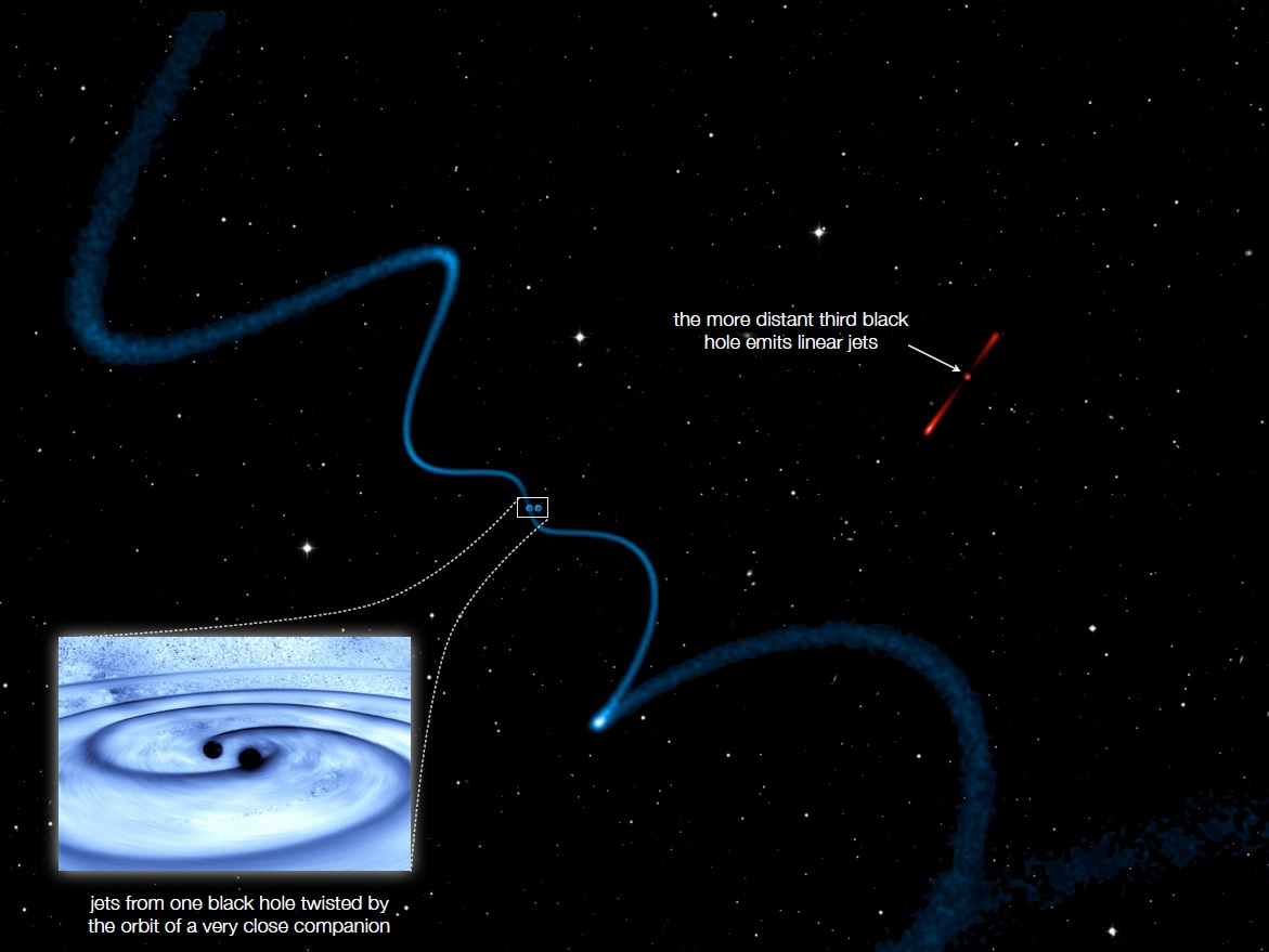 Rappresentazione artistica dei getti elicoidali emessi da uno dei buchi neri che compongono il terzetto scoperto in prossimità di una galassia distante oltre 4 miliardi di anni luce. La forma dei getti è dovuta all’interazione gravitazionale di un buco nero compagno. Il terzo è sensibilmente più lontano ed emette getti rettilinei. Crediti per l’immagine: Roger Deane, NASA Goddard
