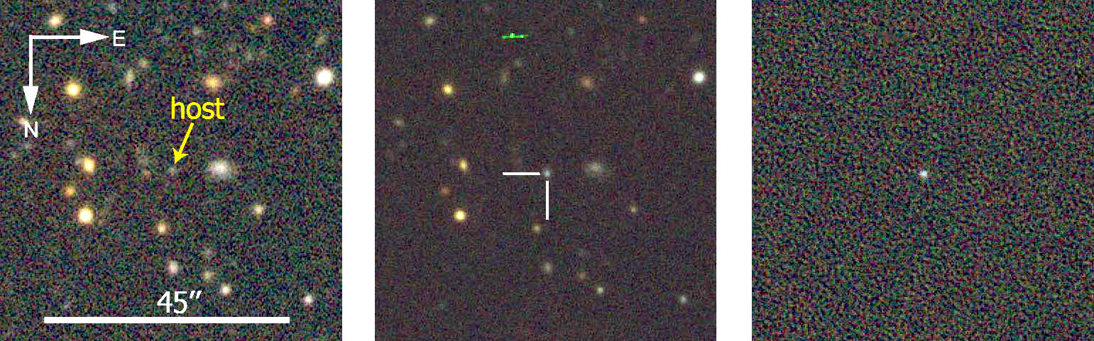 Prima (a sinistra) e dopo (al centro): sono le immagini della regione dove è stata scoperta la supernova superluminosa DES13S2cmm. Quella sulla destra è una sottrazione di queste due immagini: mostra un nuovo oggetto luminoso al centro – una supernova, appunto. Crediti: Dark Energy Survey