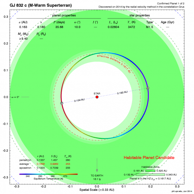 L’analisi orbitale di Gliese 832C mette in evidenza un’elevata eccentricità della Super Terra in fascia di abitabilità attorno alla vicina nana rossa Gliese 832. Sebbene la temperatura media (-20° Celsius) sia simile a quella terrestre (-18°C), è grande l’escursione termica durante la rivoluzione, con punte di freddo prossime allo zero assoluto (-248°C).