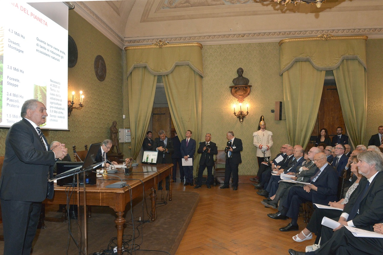 Un momento della cerimonia. In prima fila il Presidente Napolitano. Al tavolo il vicepresidente dell’Accademia Alberto Quadrio Curzio e relatore Francesco Salamini