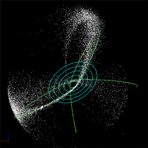 In questo modello tridimensionale della galassia Ombrello, il disco principale è indicato dai cerchi in blu, mentre la traiettoria della galassia nana attraverso lo spazio è indicato dalla curva in verde. I punti in bianco mostrano le stelle che una volta appartenevano alla galassia nana, ora disperse in un lungo flusso di stelle. Crediti: N. SINGH / UCSC.